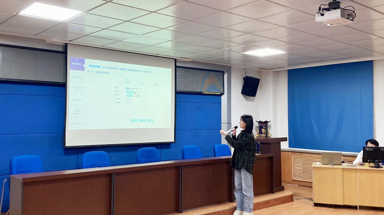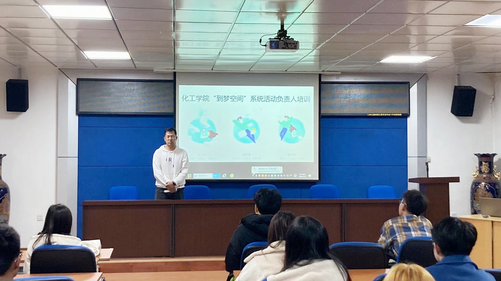 院团委副书记、办公室兼第二课堂主任陆钰、第二课堂部长王蕊在本次第二课堂教育之“到梦空间”使用及巩固提升培训上认真、详细地讲解了到梦空间管理端的功能介绍、使用方法以及活动举办的完整流程,使团学组织负责人们进一步熟悉到梦空间软件平台的操作和使用。此外还着重强调了“第二课堂成绩单”积分标准和一些注意事项,使负责人们更加了解不同活动所对应的积分,详细介绍了到梦空间活动颁布的具体流程,如:是否涉及学分的活动审核流程,不涉及学分的活动可直接发布,涉及学分的活动必须层层审核,介绍了学生在APP上报名参加流程,活动签到,活动完成后对于参加学生的积分颁布,以及其他相关注意事项。