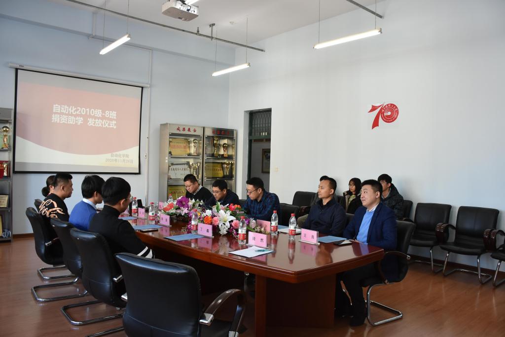 11月26日下午14时,自动化学院“校友助学金”颁发仪式在新主楼E1412会议室举行。中国知网黑龙江分公司客户服务中心主任张强、超级星座游戏体验中心企划经理赵翟、哈尔滨优纵教育教学主管丁鑫作为自动化2010级8班校友代表返校颁发助学金。自动化学院院长许家忠、学院党委书记贾红宇、学院党委副书记兼副院长徐岩,学校办公室王尧(时任自动化专业10级辅导员)、黄韬和2020级辅导员隋然、张瑞雪出席了颁发仪式。颁发仪式由贾红宇主持。