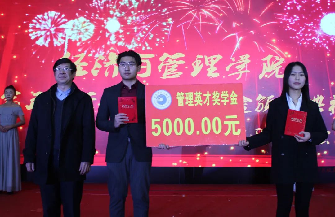 在第一乐章的最后,经济与管理学院副院长李玥宣读了“第五届管理英才奖学金”获奖名单,院党委书记周长群为获奖同学颁奖并合影留念。学院“管理英才”奖学金是由外贸90级校友出资设立,旨在奖励学习成绩优异的学子,勉励他们在今后的学习、工作、生活中能发扬经管人博学笃行的优良品质!