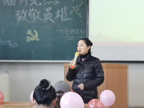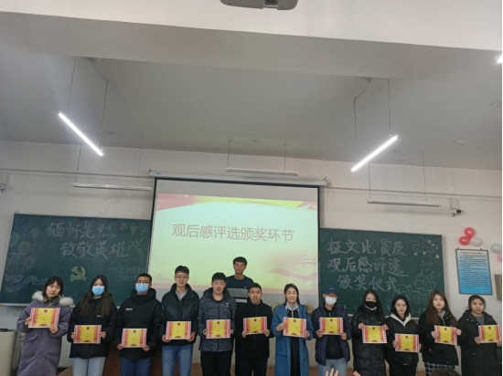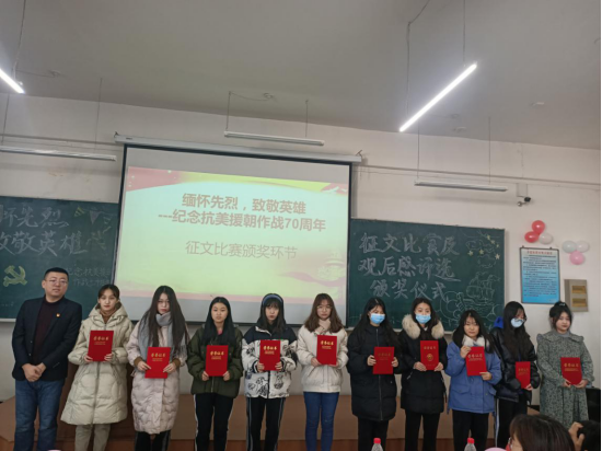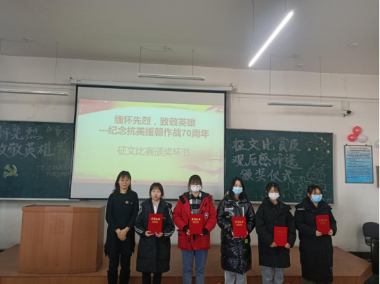 2020年12月17日中午,哈尔滨理工大学外国语学院于南区1号楼536教室举行了以“缅怀先烈,致敬英雄——纪念抗美援朝作战70周年”为主题的征文比赛及学生党员观影观后感评选颁奖仪式。外国语学院党委副书记兼副院长周晓丽,2017级辅导员、思想研究会指导教师李竖新老师,2020级辅导员、学生会指导教师王宏健老师,2018级辅导员、青年勤助中心指导教师王梓懿老师和全体获奖者和学生代表出席了本次颁奖典礼。