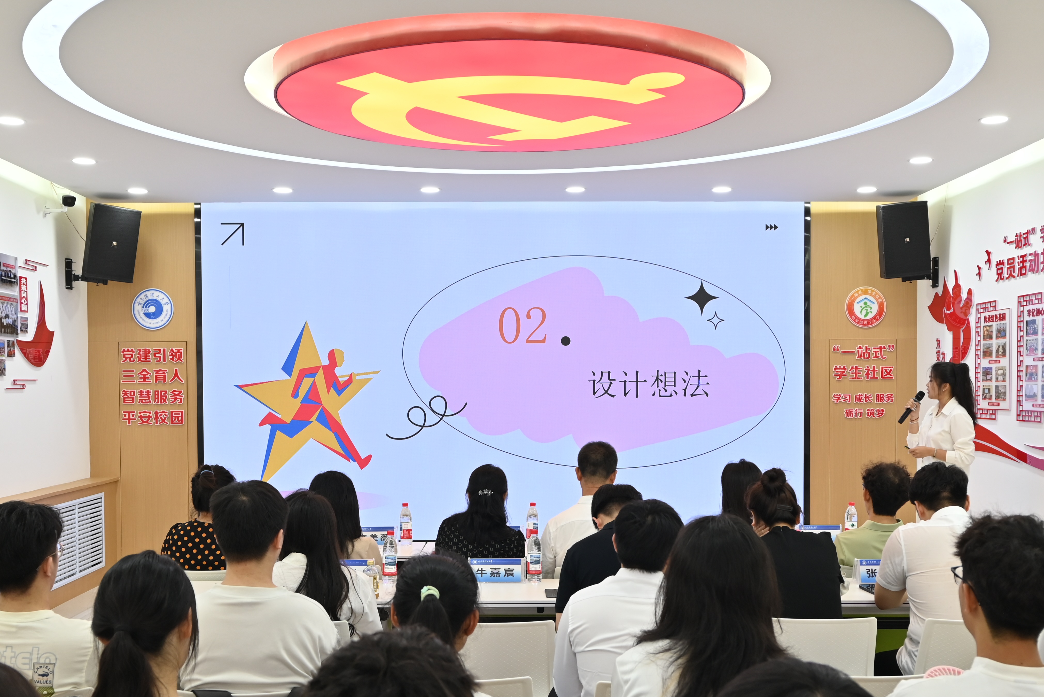 随后,获奖作品《“筑”梦》的创作者王馨灿同学与《助学天使星星》的创作者陈思儒同学分别进行设计分享。王馨灿观察到资助政策像无形的基石,默默支撑学生向上攀登,于是将“筑”与“逐”结合,将逐光化为筑光,寓意着在追逐光的路上筑梦前行,不断追逐自己的梦想,走出属于自己的理想道路;陈思儒将校训作为视觉符号,以“天使护舟,舟载希望”的叙事,诠释资助的本质,让理工学子在逐梦路上,既掌握真才实学,更厚植家国情怀。