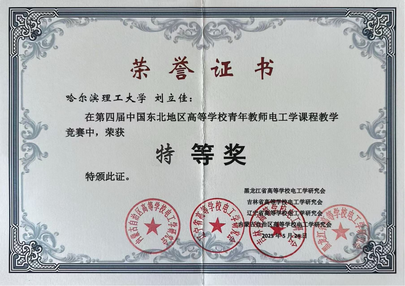 全国高等学校青年教师电工学课程教学竞赛由地区选拔赛和全国决赛2个阶段组成,全国仅设五个赛区,竞赛全面考察教师的课程设计能力、授课技巧及信息化教学手段的应用水平。刘立佳老师在哈尔滨工业大学举办的黑龙江、吉林、辽宁及内蒙古东北部四省区赛中荣获特等奖,并代表黑龙江省参加全国赛。