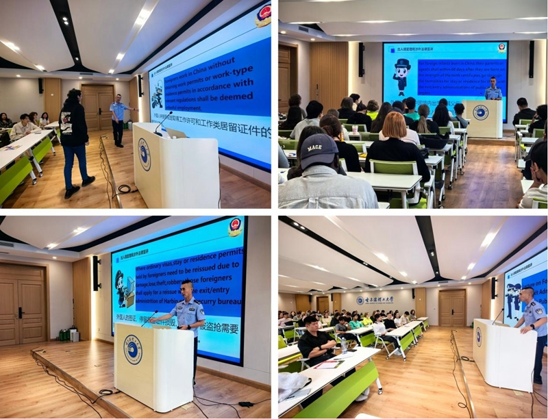 开学典礼结束后,来自出入境管理局的金云龙警官为留学生们带来了专业的涉外法律知识宣讲,详细解读了《中华人民共和国出境入境管理法》的相关条款细则,帮助学生明确什么是非法入境、非法居留、非法就业。增强了学生的法律意识和规则意识,为他们在华顺利开展学习和生活奠定了坚实的法律基础。