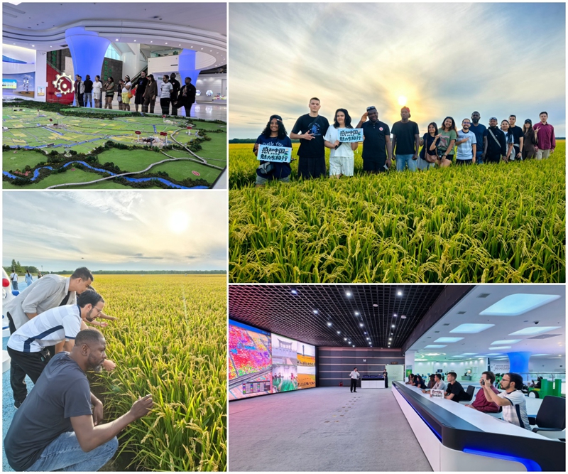 在建三江百亩大地号,一望无际的稻田随风起伏,智能农机穿梭田间。“这是我第一次见到这么大规模的现代化农田!”来自马达加斯加的留学生爱娜观看大屏幕,实时查看稻田墒情监测数据,不禁发出惊叹。工作人员现场讲解了无人机植保等智慧农业技术,留学生们近距离感受中国“北大仓”从“靠天吃饭”到“科技种粮”的跨越式发展,深刻理解“中国饭碗”的坚实根基。