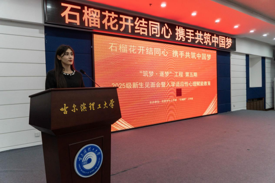 土木工程专业25-1班曲尼仓决、应用物理专业25-4班马尔胡兰·木拉盖尔作为新生代表发言。曲尼仓决结合自身经历,表达了珍惜大学时光、努力学习、积极参与校园活动的决心,同时呼吁全体新生携手共进,在新的人生阶段书写精彩篇章。马尔胡兰·木拉盖尔分享了从新疆跨越千里来哈求学的初心,立志践行“知行统一 博厚悠远”的校训,呼吁各民族同学要像石榴籽一样紧紧抱在一起,在大学生活中团结互助,共同进步。