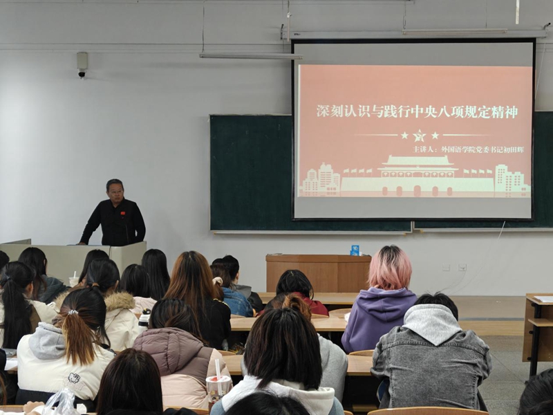 10月15日中午,外国语学院党委书记初田辉为培训班学员讲授“深刻认识与践行中央八项规定精神”首场专题党课。