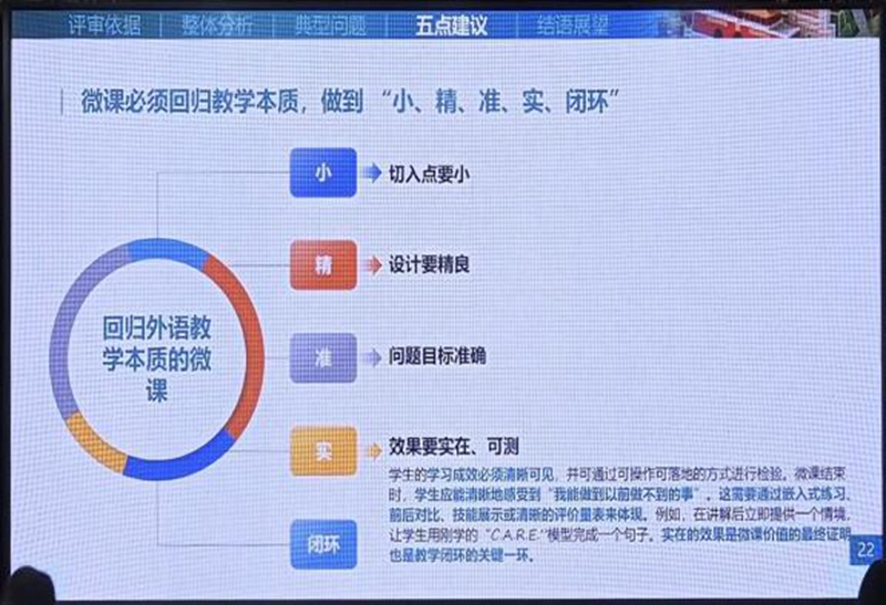现场交流环节,参赛选手需依次完成微课作品展示与说课两大核心环节。各团队充分运用多样化信息技术教学手段,将先进教学理念与生动教学内容深度融合,直观呈现外语微课的创新形态与教学价值。王泳钦团队的微课作品在众多佳作中特色鲜明,团队创新性引入“模糊限制语(Hedging)”理论,并结合教学实践构建原创的C.A.R.E.模型,通过系统化教学设计,帮助学生高效掌握伦理沟通的核心技能,精准回应职场与学术场景中常见的复杂伦理挑战。该微课“教学效果扎实、可测”的显著特点,得到了评审专家的高度认可。北京科技大学外国语学院王娜教授作为本科英语组专家代表,在赛后点评中特别强调:“在讲解核心知识点后,立即搭建情景任务,让学生运用刚学的C.A.R.E.模型完成句子创作与应用实践,这种设计不仅让教学效果看得见、可验证,更是实现教学闭环的关键一环,充分彰显了微课的实用价值。”