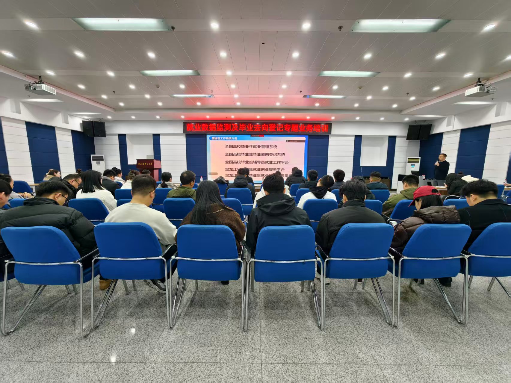 为进一步规范我校毕业生就业数据监测与管理流程,全面提升就业服务工作精细化、精准化与专业化水平,切实推动就业工作提质增效。11月3日下午,我校在西区1号楼第一宣讲厅召开就业数据监测及毕业去向登记专题业务培训会,特邀请到黑龙江省大学生就业创业指导中心信息部部长吴海鹏担任主讲嘉宾,各学院副书记、毕业班辅导员及就业中心相关工作人员现场参会,荣成学院线上参会。会议由学校党委学生工作部部长戴湘竹主持。