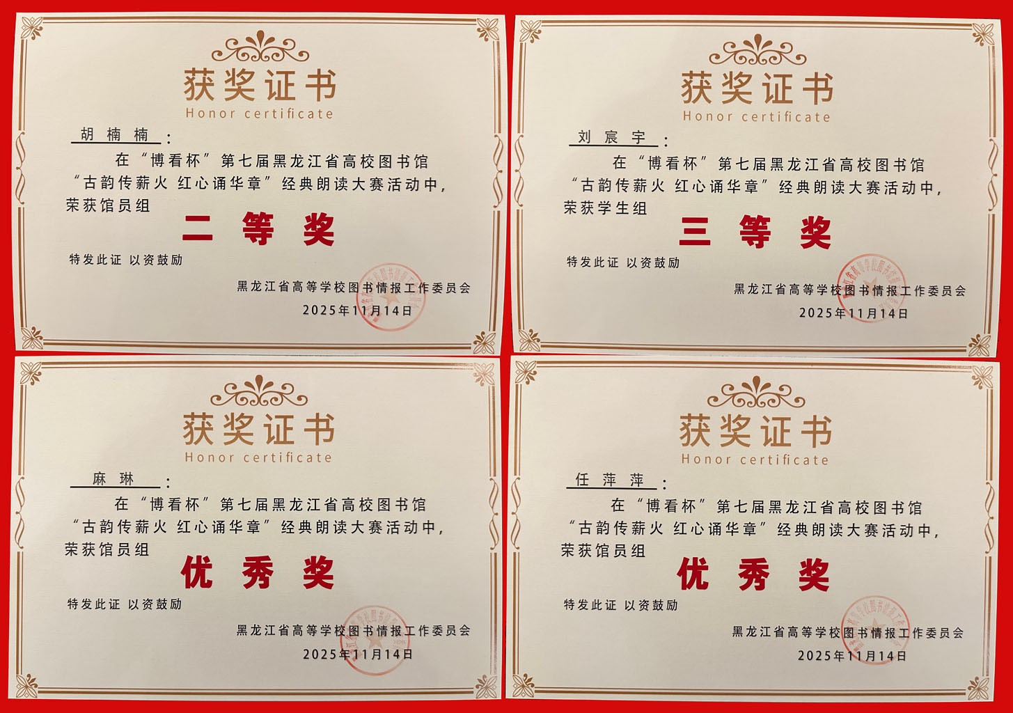 11月14日,由黑龙江省高等学校图书馆工作委员会主办的第七届博看杯黑龙江省高等学校图书馆“古韵传薪火 红心诵华章”经典朗读活动圆满结束,我校3名教师和1名学生获得奖项。
