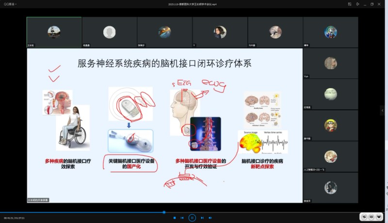 在报告会上,王长明副教授系统梳理了脑机接口技术从基础研究到应用体系构建的发展脉络。他结合典型脑机接口案例,深入解析了当前任务范式所涉及的核心原理与机制,并围绕器件、算法等关键技术环节展开探讨。在器件层面,详细评述了脑机接口产品中所用的放大器、传感器、电极及VR设备的发展现状;在算法层面,重点剖析了大数据处理、人工智能模型构建及其生物学可解释性方面亟待突破的关键问题。此外,他紧密结合临床实际需求,聚焦血管介入式脑机接口系统、睡眠与精神康复的脑机接口技术,以及卒中后运动功能障碍康复的脑机接口技术,清晰呈现了脑机接口技术在临床转化中的前景与挑战。本次学术报告会在轻松、友好、热烈地氛围中进行。