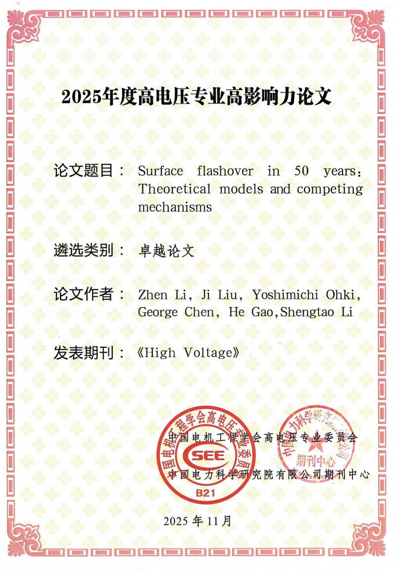 近日,在上海举行的中国电机工程学会高电压专委会2025年学术年会上,公布了2025年度高电压专业高影响力论文遴选结果。我校电气与电子工程学院高电压技术研究所副教授李枕研究成果《沿面闪络50年:理论模型与竞争机制》(Surface flashover in 50 years: Theoretical models and competing mechanisms)入选2025年度高电压专业高影响力卓越论文(序一)。