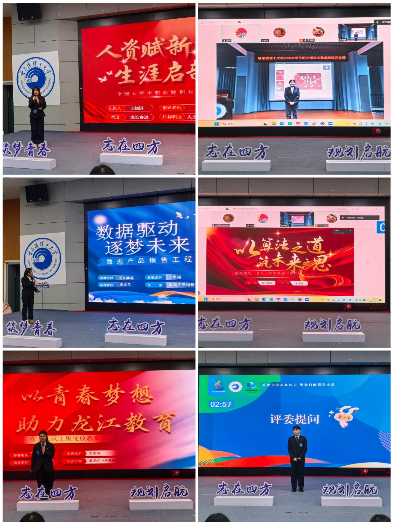 自10月份启动以来,本次职业规划大赛得到了各学院的高度重视和广泛支持,广大师生积极参与,精心备赛,赛事氛围热烈浓厚。晋级决赛的选手中,包含成长赛道6人、就业赛道本科生组6人及就业赛道研究生组5人。决赛现场,选手们以饱满的热情、清晰的逻辑思路,通过PPT展示与现场答辩相结合的形式,从自我认知、职业探索、目标设定、路径规划、行动计划等方面,系统阐述了各自的职业发展蓝图,充分展现了哈理工学子对未来的清晰思考与奋进姿态。