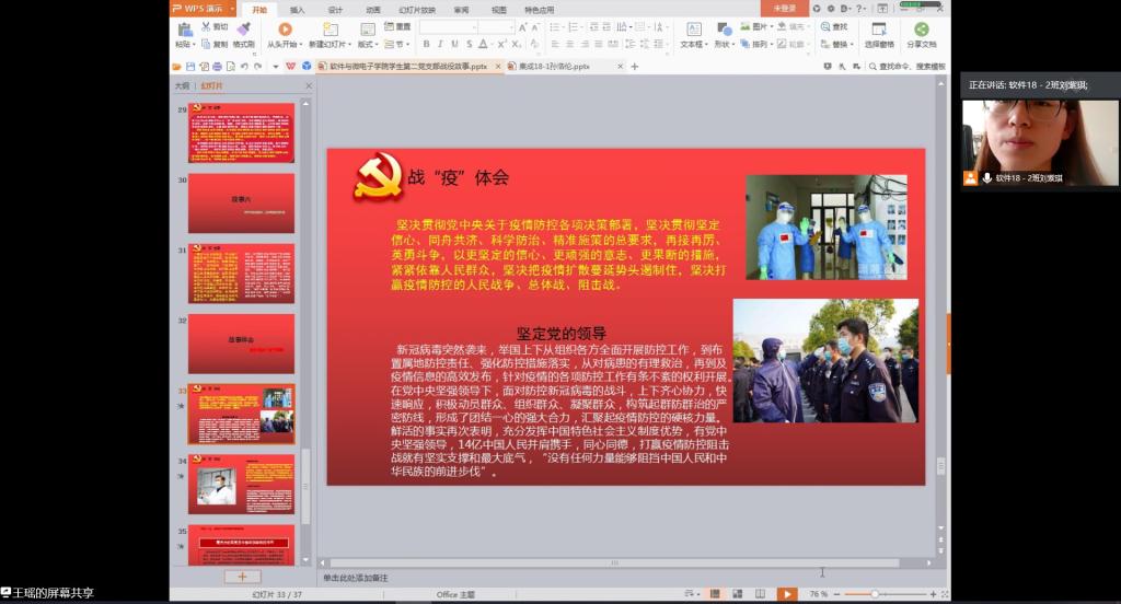 为庆祝中国共产党成立99周年,回顾党的光辉历程,讴歌建党、新中国成立以来取得的伟大成就,激发学生党员爱党、爱国、爱校的热情,构建和谐、向上的校园文化氛围;同时,借此机会,我们向这场疫情防控阻击战的最美逆行者致敬,讲述他们的战疫故事。依照我校党委的相关工作部署,软件与微电子学院学生第二党支部于6月30日上午开展以《喜迎党的生日 回顾战疫故事 守望初心使命》为主题的线上“战疫”故事组织生活会。