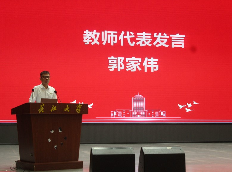 在庄严的国歌声中,开学典礼拉开了序幕。医学部教师代表郭家伟教授登台发言,对新同学们的到来表示热烈的欢迎和诚挚的祝贺,勉励新生们要走出高考“后遗症”,尽快适应新环境,爱上读书做学问,牢牢扎根在长江大学这片沃土,厚积薄发,让青春在校园里绽放光华。