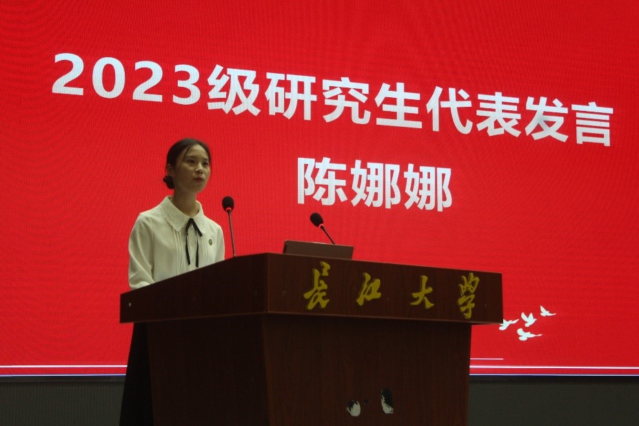 研究生新生代表陈娜娜发言,她表示将秉承“尚德勤谨,仁术长新”的院训,开启广阔的学术梦想,在守正创新中不断提升学术和人生境界,在奋斗中谱写青春华章。