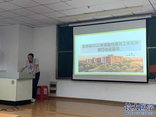 行政副部长王真对医学部2022年奖励性绩效工资实施办法进行宣讲,以及对《长江大学机关事业单位养老保险改革有关政策及情况通报》相关的重要内容进行宣讲。