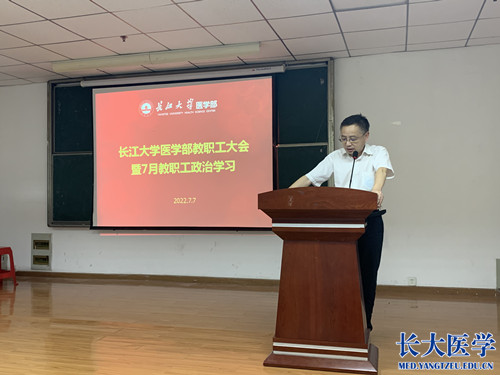 7月7日下午,在14教410会议室召开教职工大会暨7月教职工政治学习会议,医学部全体教职工参加会议,会议由健康医学院院长兼医学部副部长黄江荣主持。