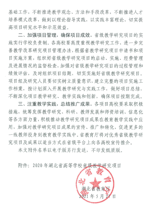 (通讯员 胡艳红)近日,湖北省教育厅印发了《省教育厅关于公布2020年湖北高校省级教学研究项目的通知》,医学部共获批3项,创历年获批数量新高。