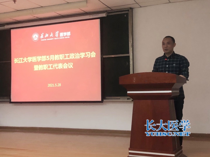 (通讯员 张渊 王喆)5月28日下午,医学部5月教职工政治学习会暨教职工代表会议,会议在14教410会议室举行,医学部全体教职工参加会议,会议分三个阶段进行,会议由党委书记关辉主持。
