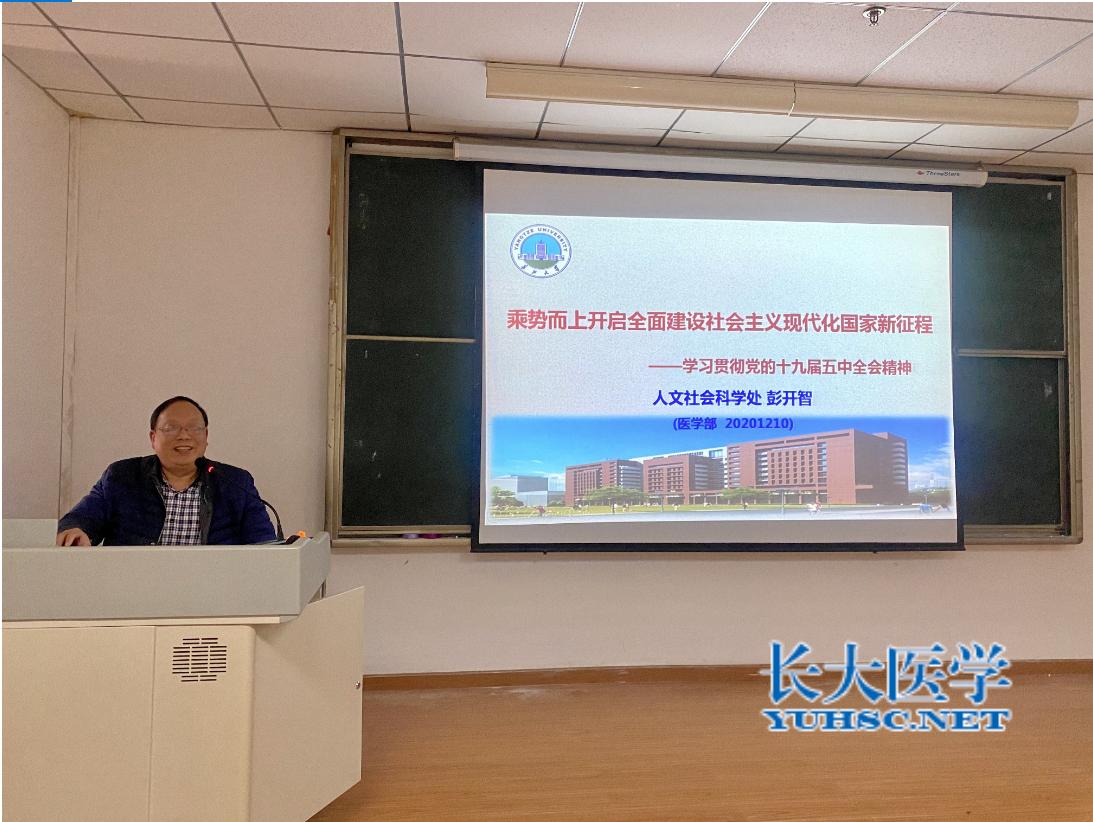 (通讯员 王喆)12月10日下午,医学部党委举办党的十九届五中全会精神宣讲会,深入学习领会习近平新时代中国特色社会主义思想。中共荆州市委宣讲团专家、长江大学人文社科处副处长彭开智教授受邀作专题报告,医学部全体党员同志参与学习。会议由医学部党委书记关辉主持。