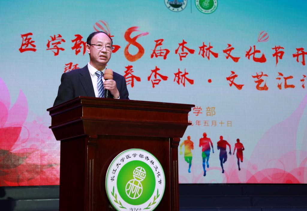在开幕式环节中,全场观众饶有兴致地观看第八届杏林文化节宣传片。医学部常务副部长任伯绪宣读文化节文件。副校长张大平发表致辞,认为长江大学医学教育经过68年的发展,与40多家医院建立了良好的合作关系,形成了由附属医院、教学医院、实习医院、社区卫生实践基地共同构成的临床教学体系,社会声誉与日俱增,张校长亲切寄语全体医学生要崇尚医德,宣扬大爱,勇做新时代的奋进者、开拓者和奉献者。