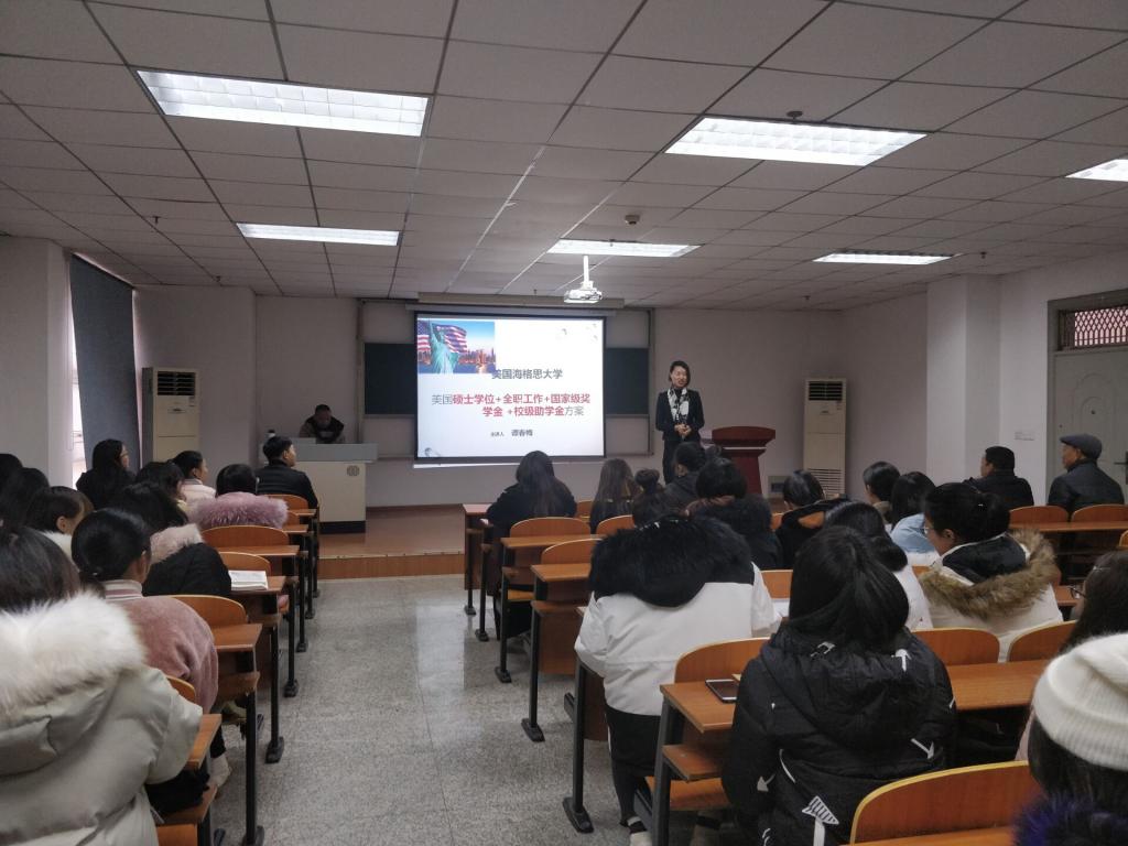 为了拓宽护理专业学生的就业思路,提供更多发展机会。医学部于12月25日下午两点半在14教南410召开赴美国就业讲座,特邀美国海格思大学国际学院谭春梅老师作为主讲人,出席本次讲座的有医学部副部长胡娅、学工办主任张昊、辅导员王乾,16级护理专业全体学生参加了本次讲座。