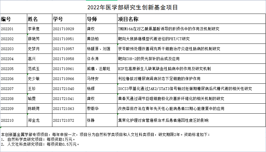 经研究生本人申请,医学部组织评审,《TMEM16A在对乙酰氨基酚诱导的肝损伤中的作用及机制研究》等10个项目被确定为医学部2022年研究生创新基金项目(见附表)。现予公示,公示期为2022年9月13日-9月15日,如有异议,请联系0716-8062635。