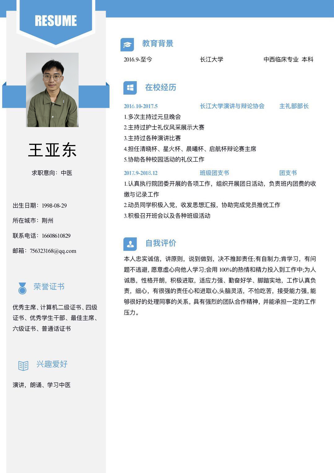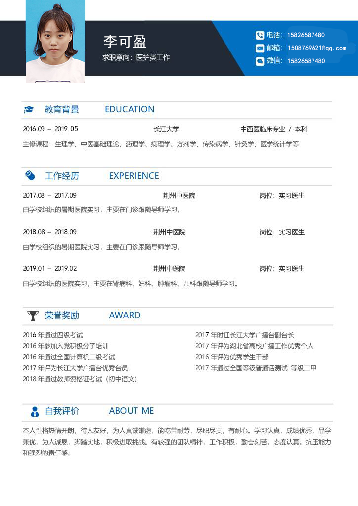 (通讯员:张洋)2019年5月5日至5月27日医学部召开简历制作大赛。本次活动以在校大学生如何设计一份优秀具有竞争力的求职简历为活动形式,指导医学部学生赢在求职的起跑线上并能在竞争激烈的求职路上脱颖而出。首先每位选手都要在规定时间展示其简历亮点,选手们使出浑身解数以期打动评委,评委们很严苛地提出一些职场问题,对选手们“毫不留情”,在紧张与激烈的“交火中”,选手们出色地完成了自己的简历介绍。之后,评委们对选手的比赛态度给予了肯定,并对选手们的简历一一做了精确点评。并表示简历当以一页简练美化为更好,更能集中表现自己的能力与才干;一个明确的求职目标是你赢得成功的关键;注重简历内容与求职意向的相关性,更能发挥简历的作用。比赛进行到这个时候,选手们已经忘却比赛的紧张,而是更多的互相学习,同步提升。经过激烈角逐,中西医临床11601王亚东,中西医11602匡英杰,李可盈分获第一、二、三等奖。