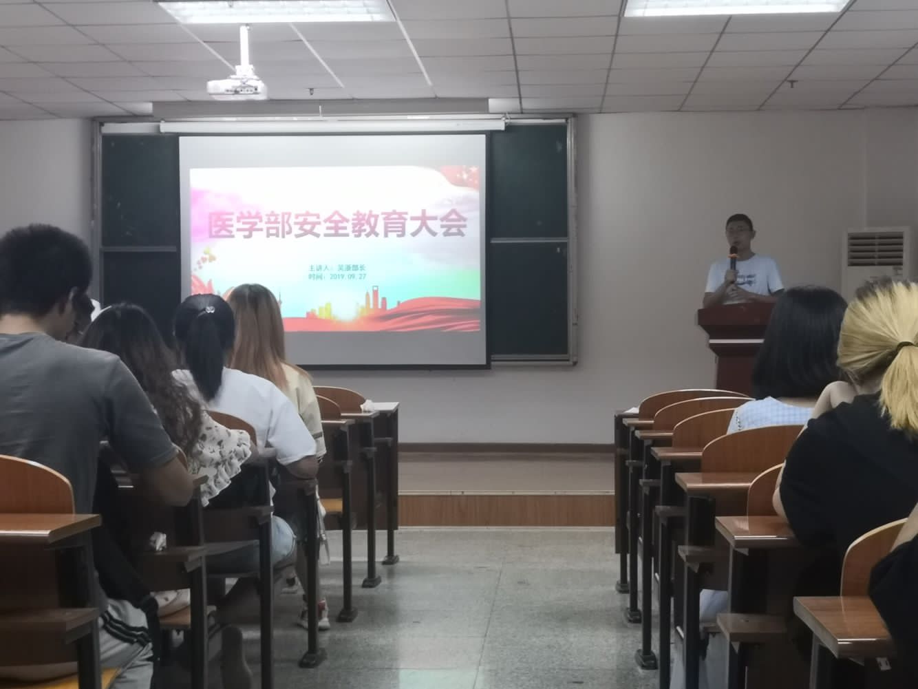 (通讯员 雍丽珍 潘俞彤 孟鑫)2019年9月27日中午12点20分,为了进一步加强学校安全教育和管理,增强学生的安全防范意识,培养良好的安全行为习惯,掌握应急避险技能,提高自救互救能力,保护生命财产安全,确保学校持续安全稳定,医学部决定在国庆节前期于东校区14教南410教室召开全院安全教育大会。参加本次大会的有医学部辅导员孟鑫老师,医学部行政部长吴浙,医学部各班班委。