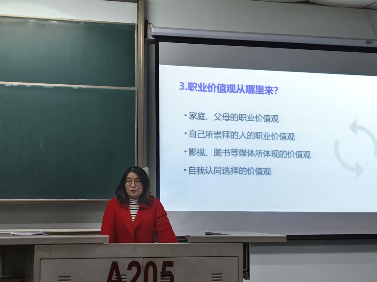 陈娟老师通过“职业价值观从哪里来”这一问题由浅入深,分别从兴趣,价值观,能力,性格四个维度进行讲解,引导学生确立正确的职业价值观,通过介绍在职业选择时应该优先考虑哪种价值,指导学生形成正确的就业观。