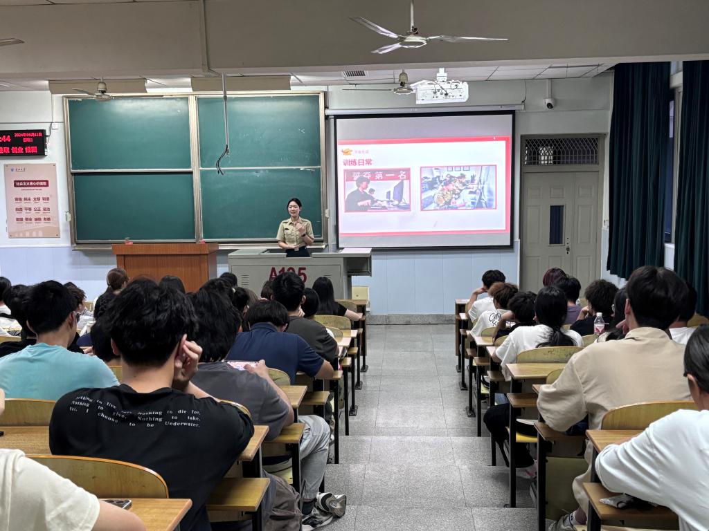 来自医学部临床12208班的退伍老兵蒋春晓同学现身说法,她结合亲身参军入伍经历。采用多媒体音视频相结合的形式从璀璨军旅生活、参军优惠政策、应征入伍条件等三个方面给在场的同学们绘声绘色的分享了个人在军营的所见所闻、所思所感、所获所得。结合个人感受和体验,她全面阐述了参军入伍的各种有利因素和条件要求,感召同学们将征兵入伍作为一个提升自我的桥梁,将个人理想与富国强军相结合,把个人成长融入强国梦、强军梦的伟大实践中。