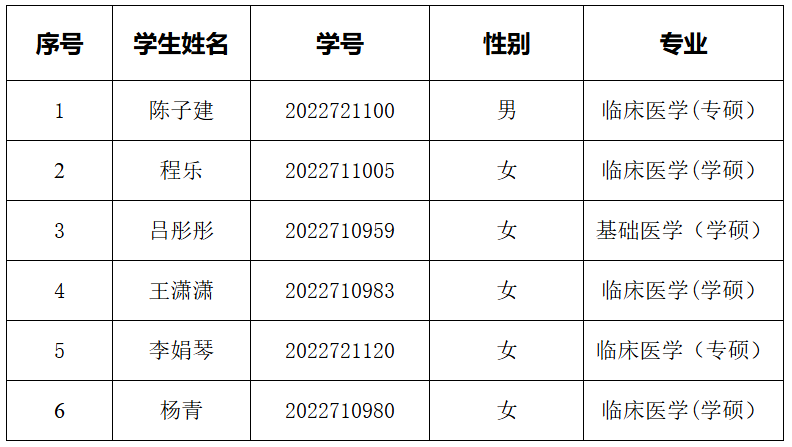 经学生本人申报、医学部国家奖学金评审委员会审核评议,以下6名同学顺序获得医学部2024年国家奖学金推荐资格,现公示如下: