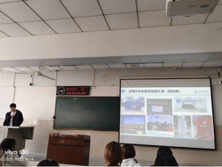 分享会上,张月阳围绕四大核心主题展开讲解,层层递进破解新生“竞赛困惑”。在“大创赛”板块,他不仅明确了大创赛的项目类型、申报要求与关键时间节点,更点出其核心价值。谈及“全国大学生医学创新大赛”,他重点解读赛事“早进课题、早进实验室、早进团队”的培养目标,让新生明白参赛不仅是拿奖,更是锻炼自主创新科研思维与实验技能的过程,且不同级别奖项对保研的“加分效应”也各不相同。