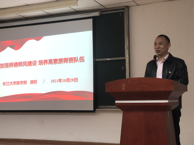 常务副部长龚权就“加强师德师风建设 培养高素质师资队伍”为主题带领全体教职工学习习近平总书记的重要讲话精神,通过部分师德失范典型案例进行警示教育,结合“四有好老师”、“四个引路人”、“四个相统一”强调医学部全体教职工要做到“以德立身”、“以德立学”、“以德施教”、“以德育德”,带头践行社会主义核心价值观,以高尚的道德情操教育学生、以仁爱之心对待学生。