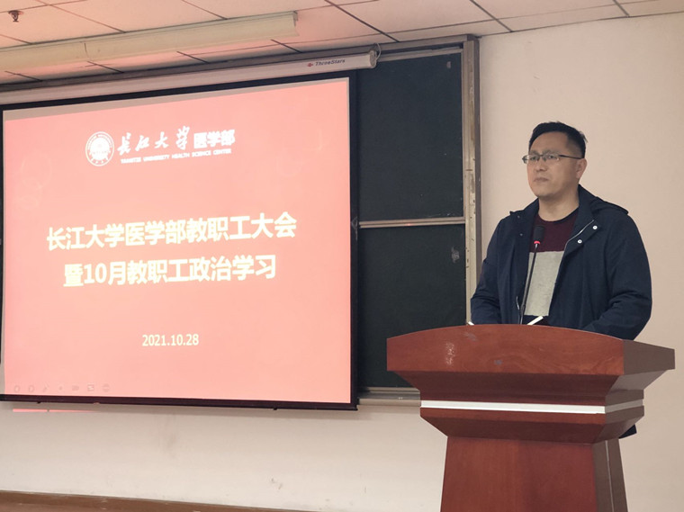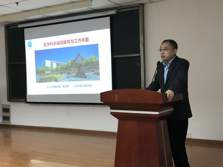 副部长黄江荣根据《关于开展医学科研诚信与作风建设专项教育整治活动的通知》(鄂卫通[2021]67号)文件精神,对国家、湖北省等出台相关文件进行解读,并分析相关科研诚信违规案例进行科研诚信教育,部署医学部科研诚信教育活动,要求各系部认真学习文件,进行专题教研活动,按照时间节点保质保量完成任务。