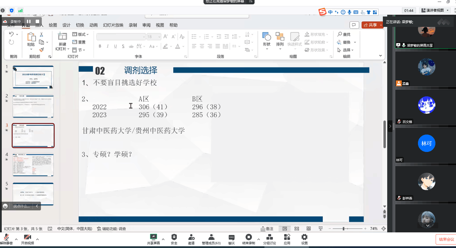 梁梦敏学姐就调剂流程及注意事项进行了分享,并重点强调调剂是场信息战,多关注研招网、意向学校研究生官网及学校微信公众号等方式及时获取调剂信息,甄别信息,避开热门学校和专业,调剂过程时间紧,学习任务重,建议报考中医基础、中西医基础、基础医学、生理学、免疫学等基础类冷门专业,会增加成功调剂的可能。