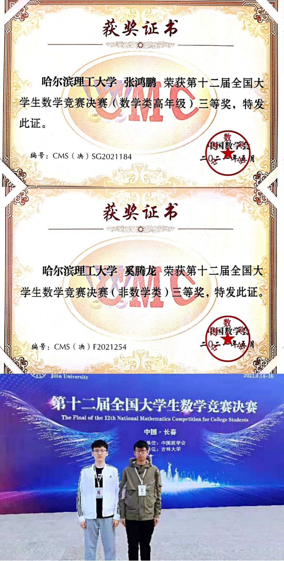 人。我校信息与计算科学专业的张鸿鹏、车辆工程专业奚腾龙代表黑龙江赛区参赛,均荣获了全国决赛三等奖的好成绩。