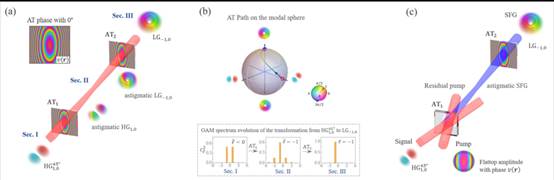 最近,测通学院朱智涵、中科大史保森联合团队围绕前沿课题“高维矢量频率接口的物理实现”中取得关键技术突破(Optica 2022, 9(2): 187-196)。在此基础上,进一步提出可实现高阶高斯模态变换与几何相位非线性操控的“像散频率接口”技术(见图2)。该前瞻性技术的提出与论证,一方面,赋能光学频率接口操控空间模态间信息交互的能力,拓展出全新的光子态操控概念;另一方面,在基础物理层为OAM守恒定律带来了新的疑问:为何两束不携带净OAM的光束却能够通过参量相互作用产生一束携带净OAM的新光束?
