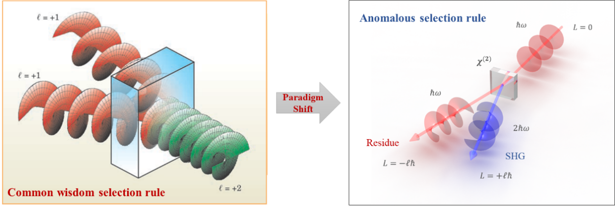 图1 三波混频参量过程中的OAM守恒示意图,左图为OAM守恒规律的经典范式,而右图为新揭示的反常守恒规律(系统OAM仍保持守恒)