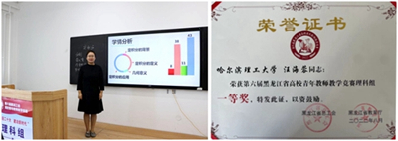 团队参加了全部六届黑龙江省高校青年教师教学竞赛,共获得一等奖4项、二等奖1项、三等奖1项。汪海蓉老师在第六届黑龙江省高校青年教师教学竞赛中喜获一等奖。