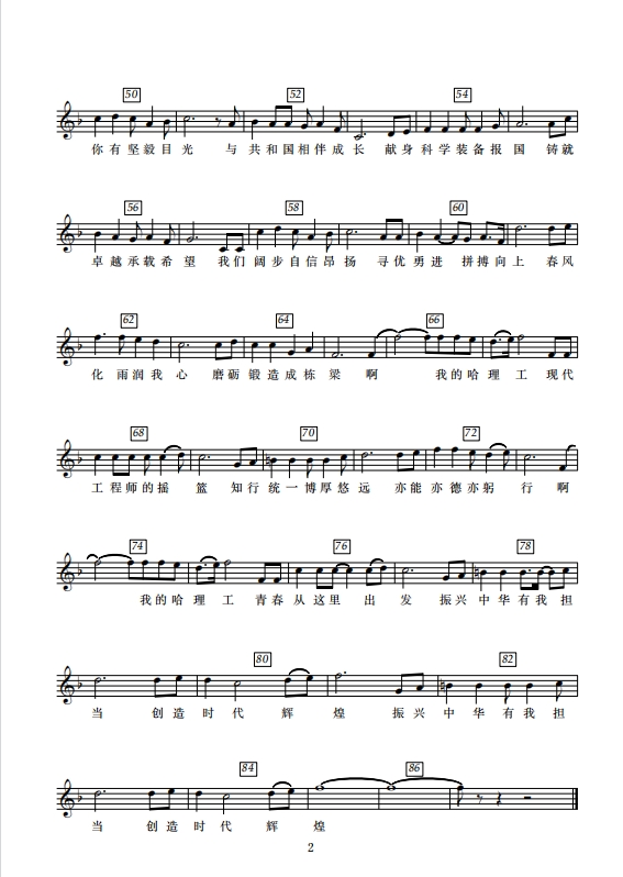 主歌部分: 你在祖国北方 学子菁菁书声朗朗 大珩精神薪火相传 三电黄埔美誉远扬 学校主校区位于祖国最北省份,校园优美,学风浓厚。大珩精神是“两弹一星”元勋、老校长王大珩院士为学校留下的宝贵精神财富,《哈尔滨理工大学章程》中对的大珩精神的概括为:忠诚祖国、献身科学、淡泊名利、寻优勇进。用大珩精神、三电黄埔突出学校的精神传承、学科特色和社会美誉。 我们来自四面八方 为了理想励志图强 寒风酷雪塑我心 传道授业助成长 哈理工人来自祖国各地,心有大我、至诚报国。寒风酷雪的自然环境塑造了坚毅品格,勤学笃行、求是创新的躬耕态度服务人才培养。 你有坚毅目光 与共和国相伴成长 献身科学装备报国 铸就卓越承载希望 学校1950年建校,与共和国发展同向同行,同频共振,深耕机电行业,矢志艰苦奋斗,献身科学装备报国的理想信念坚定不渝,为我国装备制造业发展和黑龙江经济社会建设作出重要贡献。 我们阔步自信昂扬 寻优勇进拼搏向上 春风化雨润我心 磨砺锻造成栋梁 哈理工人坚定自信充满活力,在探索科学与创新的道路上追求卓越拼搏进取。在启智润心、乐教爱生的良好教育环境中,教师坚守立德树人初心,为党育人、为国育才,学生勤学苦练成长为可堪大用能担重任的栋梁之才。 副歌部分: 啊,我的哈理工 现代工程师的摇篮 知行统一博厚悠远 亦能亦德亦躬行 突出学校“知行统一 博厚悠远”校训。学校为我国现代化建设培养了以院士、将军、企业家、工程技术领军人才为代表的20余万优秀校友,被誉为“现代工程师的摇篮”。老校长王大珩院士提倡“卓育人才 亦能亦德”,学校始终重视培养德才兼备、躬行实践的人才,为推进科技创新、实现教育科技人才强国战略贡献力量。 啊,我的哈理工 青春从这里出发 振兴中华有我担当 创造时代辉煌 哈理工人朝气蓬勃,在新时代新征程中用奋斗做青春最亮丽的底色,体现出为中国式现代化挺膺担当、实现中华民族伟大复兴的信心和决心! 新版校歌音乐大气恢宏、充满力量,主歌部分铿锵有力,副歌部分悠扬流畅;歌词饱含深情并具有丰富的思想内涵,既铭刻历史印记,又折射时代精神。新版校歌作为弘扬哈理工精神的重要名片,旨在以歌曲形式继承和发扬学校优良传统,突出办学特色,抒发全校师生的远大抱负和青春理想,讴歌中华民族伟大复兴梦想。