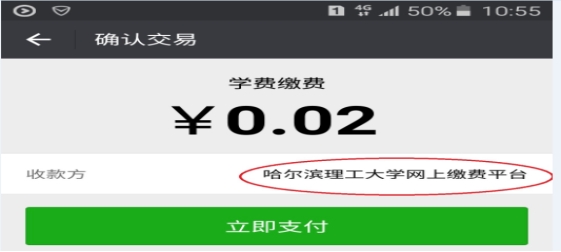 1.通过在线缴费时,请确认商户名称为:哈尔滨理工大学。