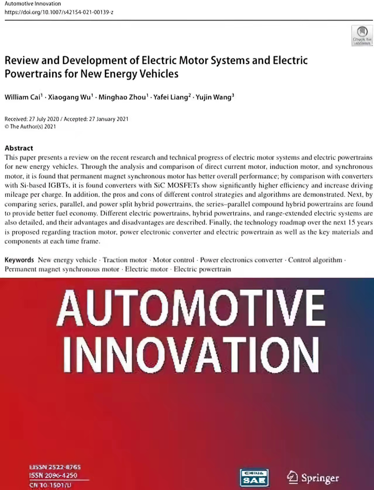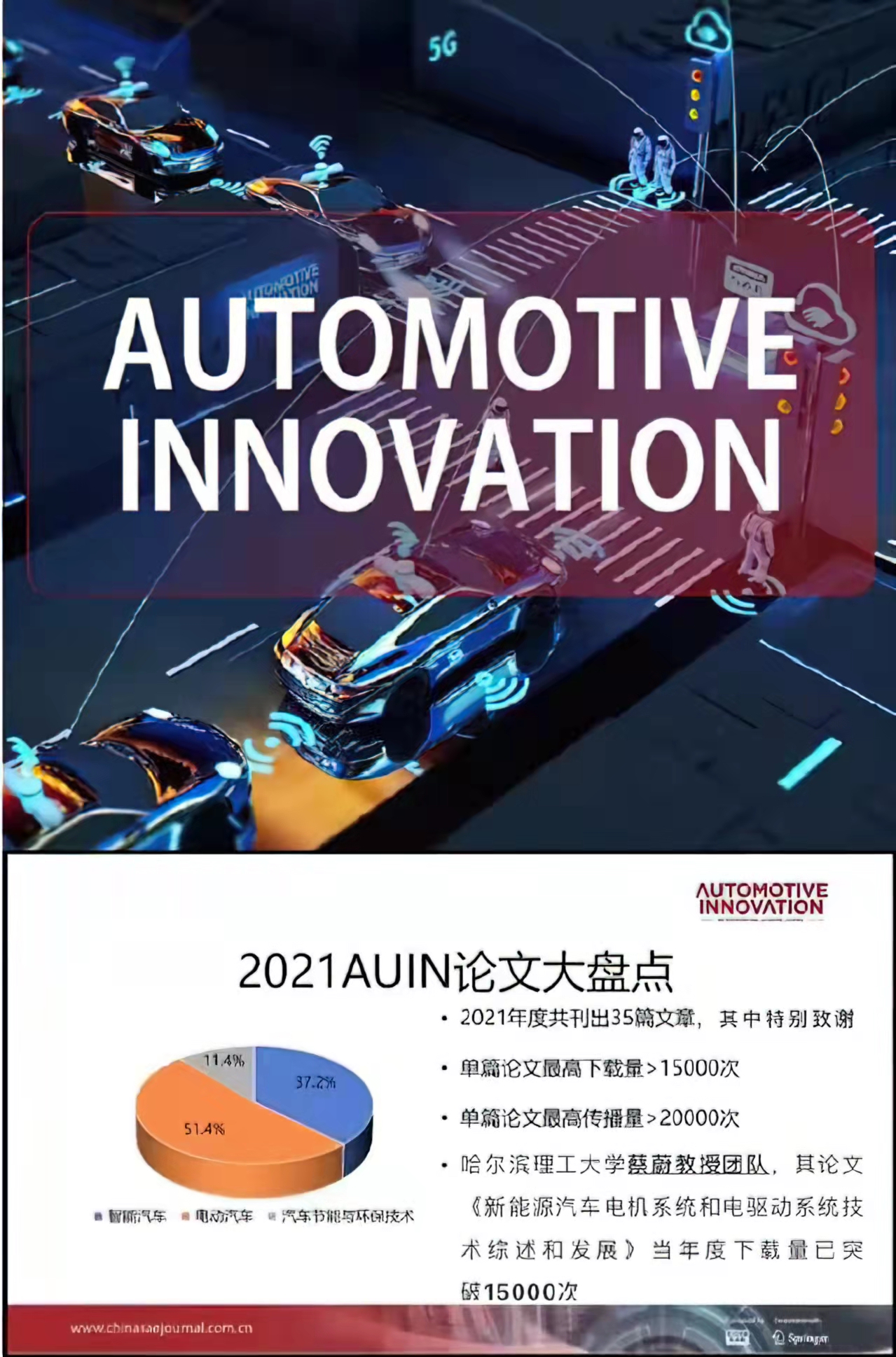 2021年的新冠疫情并没有停下汽车电动化的进程,也没能阻碍哈尔滨理工大学蔡蔚教授及其团队学术创新的步伐。在“双碳”愿景下,蔡蔚教授率领团队成员于2021年2月联名发表在《Automotive Innovation》(AUIN)的文章“William Cai, Xiaogang Wu, Minghao Zhou, Yafei Liang, Yujin Wang,Review and Development of Electric Motor Systems and Electric Powertrains for New Energy Vehicles” (中文译名:蔡蔚,吴晓刚,周铭浩,梁亚非,王欲进;新能源汽车电机系统和电驱动系统技术综述和发展)。截至2021年12月,当年度的下载量已突破15000次,获得了AUIN的特别致谢。