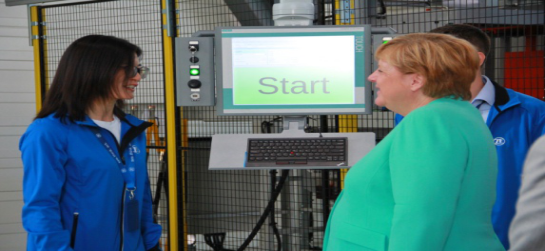 英语2001级校友张兰向德国总理默克尔介绍公司产品