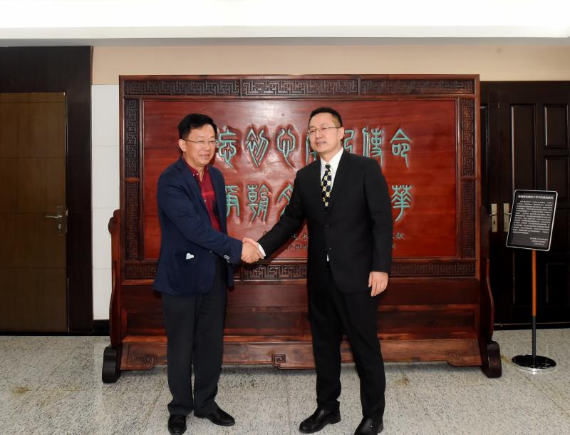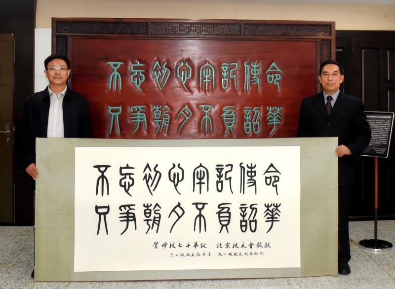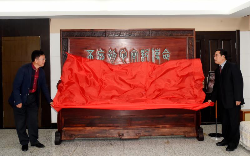 郭二军副校长与北京校友会荣誉会长李云龙为“紫檀宫廷榫工艺书法篆刻屏风”揭幕