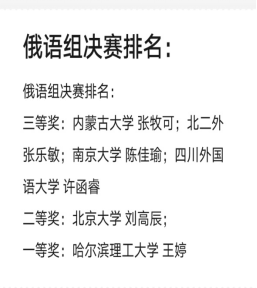 本届大赛共设置七个组别,分别为俄语、日语、法语、德语、朝(韩)语、西班牙语、阿拉伯语组,分初赛、复赛、决赛三个阶段,俄语组共吸纳来自全国150所院校的参赛选手,9月29日经过紧张的初赛选拔最终包括北京大学、南京大学、北京外国语大学、北京语言大学、北京第二外国语学院、黑龙江大学、天津外国语大学、哈尔滨理工大学在内的15所高校的15名选手入围复赛,10月24日在激烈的复赛角逐中哈尔滨理工大学、北京大学、四川外国语大学、南京大学、北京第二外国语学院、内蒙古大学共六所学校选手进入总决赛,最终王婷同学在决赛环节中稳定发挥,俄译汉及汉译俄环节均保持极高的水平,最终在与北大、南大、川外、北二外、内大这五所高校选手的同台竞技中依靠着准确的翻译,得体的仪态,稳定的发挥获得了冠军,用实力为理工大学赢得了来自全国俄语人的掌声和赞许。