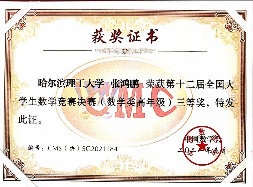 第十二届全国大学生数学竞赛决赛于5月15日在吉林大学举行,此次决赛分为数学类高年级组、数学类低年级组和非数学类三个组别进行。本次竞赛的初赛共有32个赛区206921人报名参加,经过选拔共有来自清华大学、北京大学等207所高校的646人参加决赛,其中数学专业组343人,非数学专业组303人。我校信息与计算科学专业的张鸿鹏、车辆工程专业奚腾龙代表黑龙江赛区参赛,均荣获了全国决赛三等奖的好成绩。