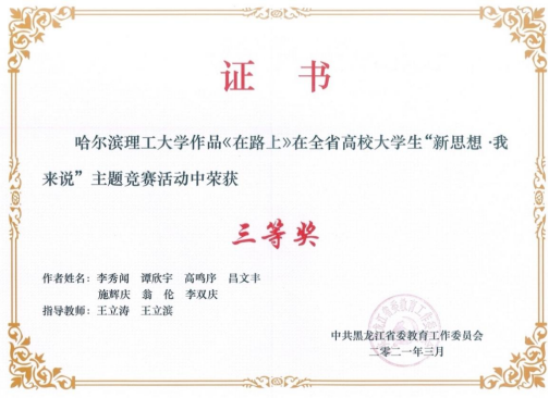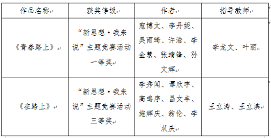 为深入推进习近平新时代中国特色社会主义思想进教材进课堂进头脑,坚持不懈坚持用习近平新时代中国特色社会主义思想铸魂育人,深入实施新时代学校思想政治理论课改革创新先行试点专项工作,省教育工委开展了全省高校大学生“新思想·我来说”主题竞赛活动,我校高度重视此项活动,党委学生工作部与马克思主义学院共同制定方案、发布通知、广泛宣传动员、精心组织申报,我校推荐的作品获得一等奖一项、三等奖一项、李龙文、叶丽两位教师荣获“优秀指导教师”称号,我校获得“优秀组织奖”称号。