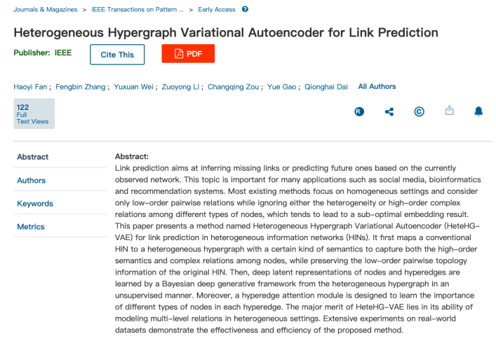 近日,国际顶级期刊《IEEE Transactions on Pattern Analysis and Machine Intelligence》(IEEE TPAMI)以长文(regular paper)形式接收了我校计算机科学与技术学院网络与信息安全研究室的学术论文“Heterogeneous Hypergraph Variational Autoencoder for Link Prediction”(DOI: 10.1109/TPAMI.2021.3059313)。2017级博士研究生樊好义为该论文的第一作者,导师张凤斌教授为通讯作者。这是我校首次在该期刊上发表论文。