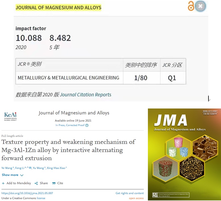 Elsevier出版社出版的《Journal of Magnesium and Alloys》杂志是全球第一本专注于镁及镁合金的学术期刊,最新影响因子IF=10.088,中科院一区TOP期刊,位居全球80种SCI收录的冶金与冶金工程类学术期刊第1位,主编是中国工程院院士潘复生教授。